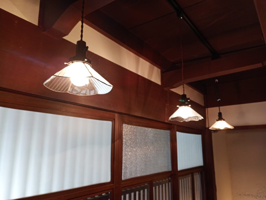店舗の家具や備品等は、厚子さんご自身が地元のお店を回って選んだもの。ランプシェイドを自作された照明もあります。やわらかな灯りが、古民家ならではの落ち着いた空間を優しく照らしています。